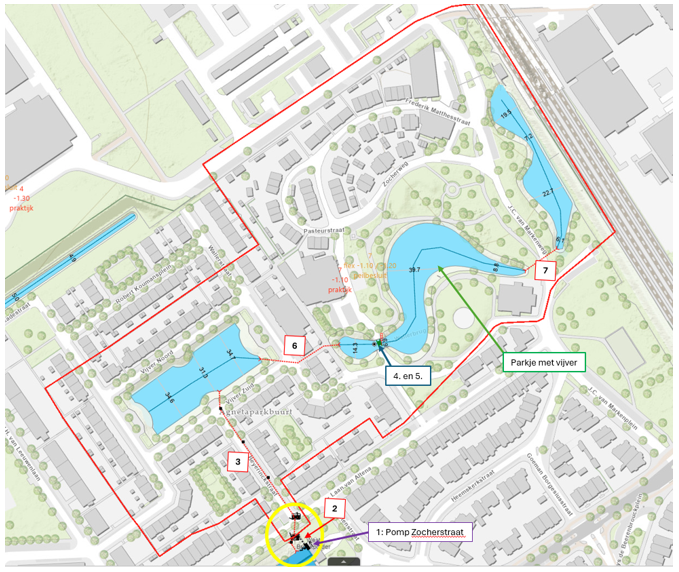 Bij de Zocherstraat staat een pomp [1]. Via een persleiding [3] en een duiker [2] stroomt het water in de eerste van de drie waterpartijen. In deze duiker bevindt zich overlaatstuw 219418, waarmee het water op peil wordt gehouden. Ook bevindt zich in duiker 21900408 een stuw (zie figuur 5-1). Overtollig water stroomt over de stuw weg. Deze stuw ligt vlak naast de pomp. Bij de brug [5.] in de tweede waterpartij bevindt zich peilschaal ‘WP219 9 08’ [4.]. Bij droogte zakt het water uit.