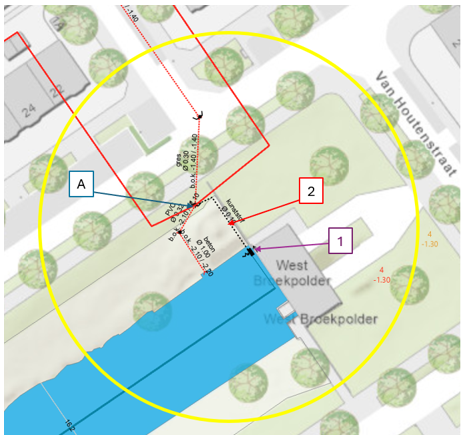 Figuur 5-1: locaties overlaatstuw (A), pompje (1) en duiker (2)