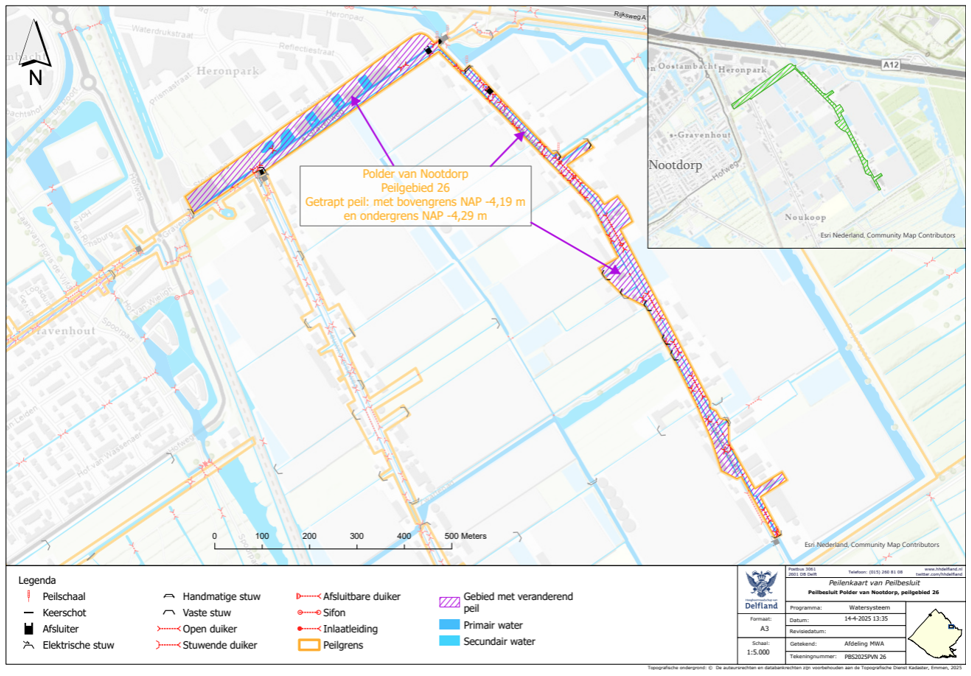 In 2014 is een waterpeil voor het nieuwe peilgebied 26 vastgesteld in het peilbesluit3 Polder van Nootdorp. Een deel van de peilenkaart van dat peilbesluit is te zien op Figuur 3.
