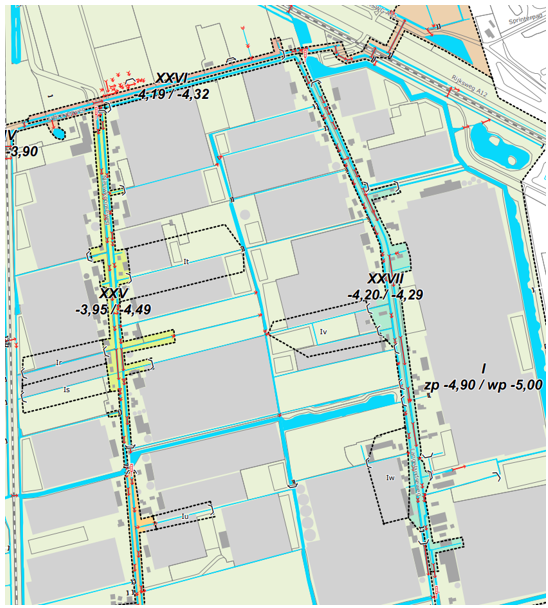 Voor het huidige peilgebied 26 is een getrapt waterpeil vastgesteld tussen 4,19 meter beneden NAP en 4,32 meter beneden NAP. Voor het huidige peilgebied 27 is een getrapt waterpeil vastgesteld tussen 4,20 meter beneden NAP en 4,29 meter beneden NAP.