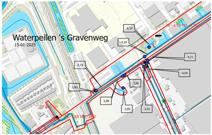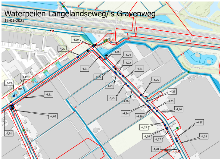 Figuur 5 Gemeten waterpeilen op 15-01-2025 langs de ’s-Gravenweg en de Langelandseweg