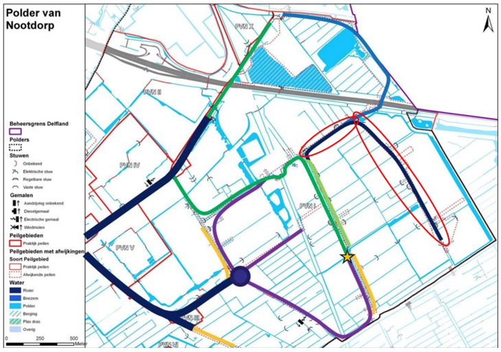 Voor het bepalen van het peil is het van belang dat dit peilgebied onderdeel is van het spuislotensysteem waarmee water wordt verspreid over de polder. De watergangen in het peilgebied wordt gebruikt om water door te voeren naar andere gebieden binnen de Polder van Nootdorp. Het spuislotensysteem wordt beschreven in paragraaf 3.3.