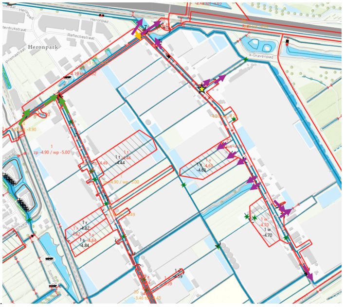 Figuur 8 – Kaart met de praktijksituatie van de waterhuishouding. Groene peilen geven de locaties aan waar water in peilgebied 26 ingelaten kan worden. Paarse peilen geven de locaties aan waar het water het peilgebied uit kan stromen. De oranje peil geeft de inlaat aan tussen huidig peilgebied 26 en huidig peilgebied 27 die in de praktijk altijd open staat. De gele ster geeft de locatie van meetpunt OW215976 weer.