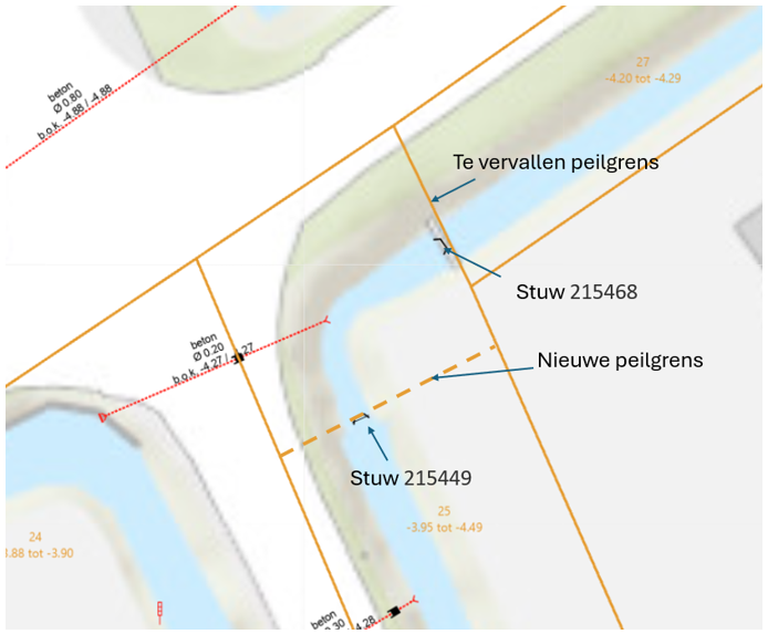 De peilgrens met peilgebied 25 ligt in de praktijk over een andere stuw dan in het officiële peilbesluit. In de praktijk loopt de peilgrens over stuw 215449. Stuw 215468 ligt geheel onder water en heeft geen functie voor het watersysteem.