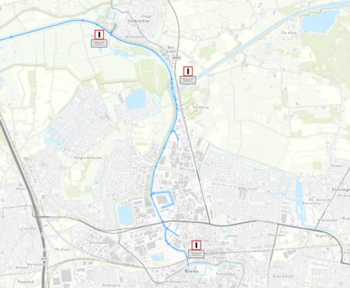 Het dagelijks bestuur van waterschap Brabantse Delta besluit om gedurende de werkzaamheden de verkeerstekens B.8 (Verbodsteken: Verplichting bijzonder op te letten) en F.3 (onderbord met tekst: “beperkte doorvaart i.v.m. evenement op zaterdag 4 oktober 2025 tussen 09:00 en 16:00 uur. Passage uitsluitend i.o.m. de organisatie”), conform bijlage 7 van het Binnenvaartpolitiereglement, tijdelijk aan te brengen op zaterdag 4 oktober 2025 nabij de drie locaties: Belcrumweg, Pontjespad te Breda en het Markkanaal te Terheijden, zoals hieronder aangegeven: