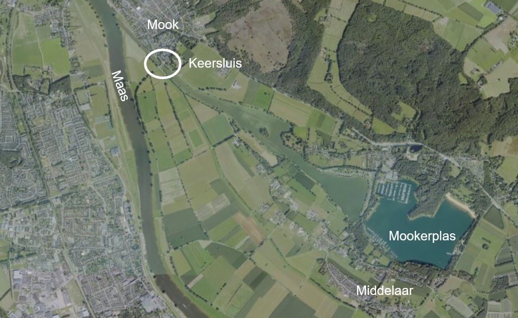 Keersluis Mook ligt tussen de Maas en de Mookerplas ter plaatse van de Cuijksesteeg in Mook (zie figuur 2-1 en 2-2). De sluis is geconstrueerd in 1996. Aan zuidwestzijde is de Meulenbroekstraat gelegen. Aan noordoostzijde ligt de Startsedijk. In de Mookerplas bevindt zich een aantal jachthavens. De recreatievaart maakt gebruik van de keersluis voor de verbinding met de Maas. De sluis en brug bij de Cuijksesteeg vormen de landschappelijke overgang vanuit Mook naar de uiterwaarden van de Maas en het Maasheggenlandschap. Het vormt daarnaast ook een belangrijk recreatief knooppunt voor onder andere fietsers en wandelaars. Het toegangskanaal tussen de Mookerplas en de Maas is eigendom en in beheer van LeisureLands.