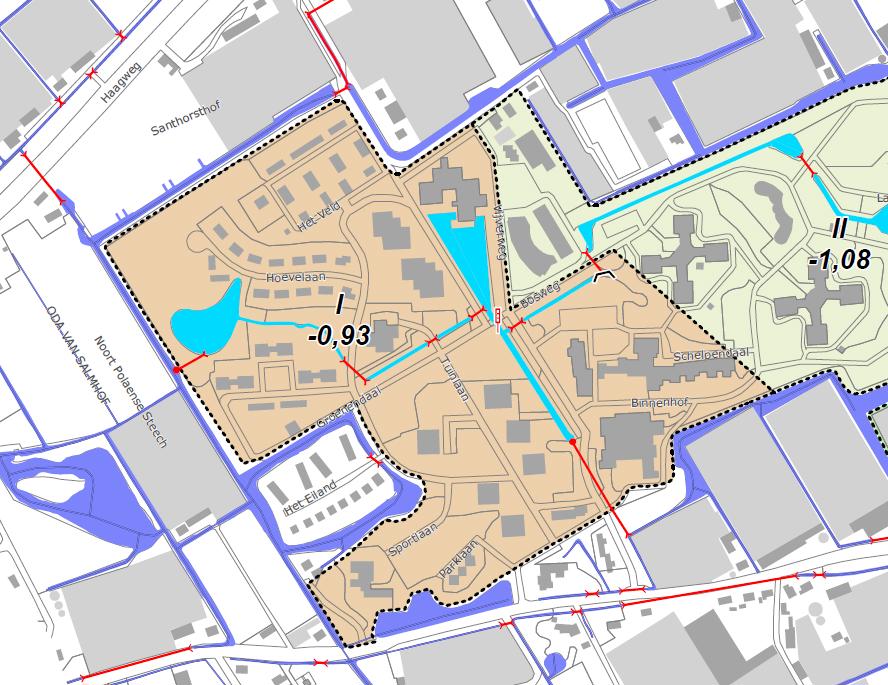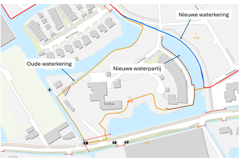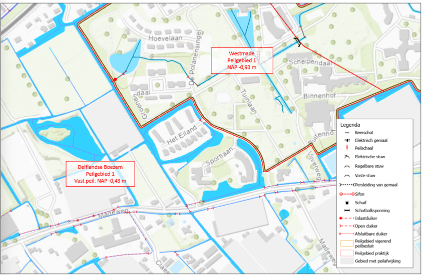 De blauwe lijn (figuur 5) geeft de huidige ligging van de waterkering weer, terwijl de oranje lijn de voormalige ligging van de waterkering weergeeft. Door de verplaatsing van de waterkering maakt het gebied tussen de oude en de nieuwe ligging van de waterkering nu onderdeel uit van peilgebied 1 van de Delflandse Boezem en niet meer van peilgebied 1 van de polder Westmade.
